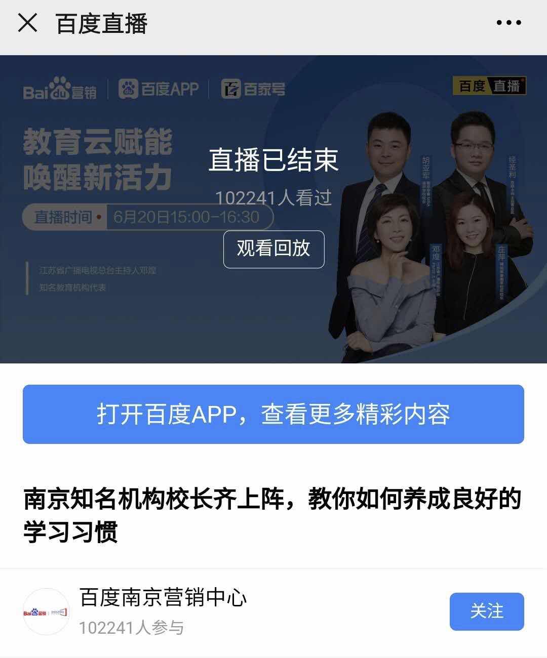 6月20日,百度營銷聯(lián)合江蘇廣播、厚學(xué)網(wǎng)發(fā)起的“教育云賦能 喚醒新活力”——百度營銷助力南京教育培訓(xùn)業(yè)復(fù)蘇公益計(jì)劃直播專場圓滿落幕。
