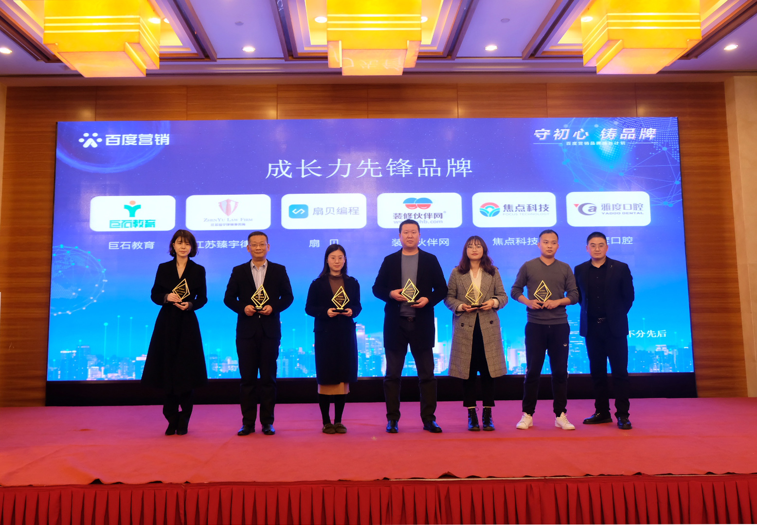 南京是一座歷史文化名城,同時也是一座創(chuàng)新名城,在創(chuàng)新的路上匯聚了眾多品牌力量。在發(fā)布會上,根據(jù)數(shù)據(jù)趨勢、百度搜索熱度排名等數(shù)據(jù),首屏百度營銷(南京)服務中心分別為巨石教育、焦點科技、扇貝、裝修伙伴網(wǎng)、江蘇臻宇律所、雅度口腔6家企業(yè),頒發(fā)“成長力先鋒品牌”榮譽獎項,以鼓勵品牌企業(yè)長遠發(fā)展。