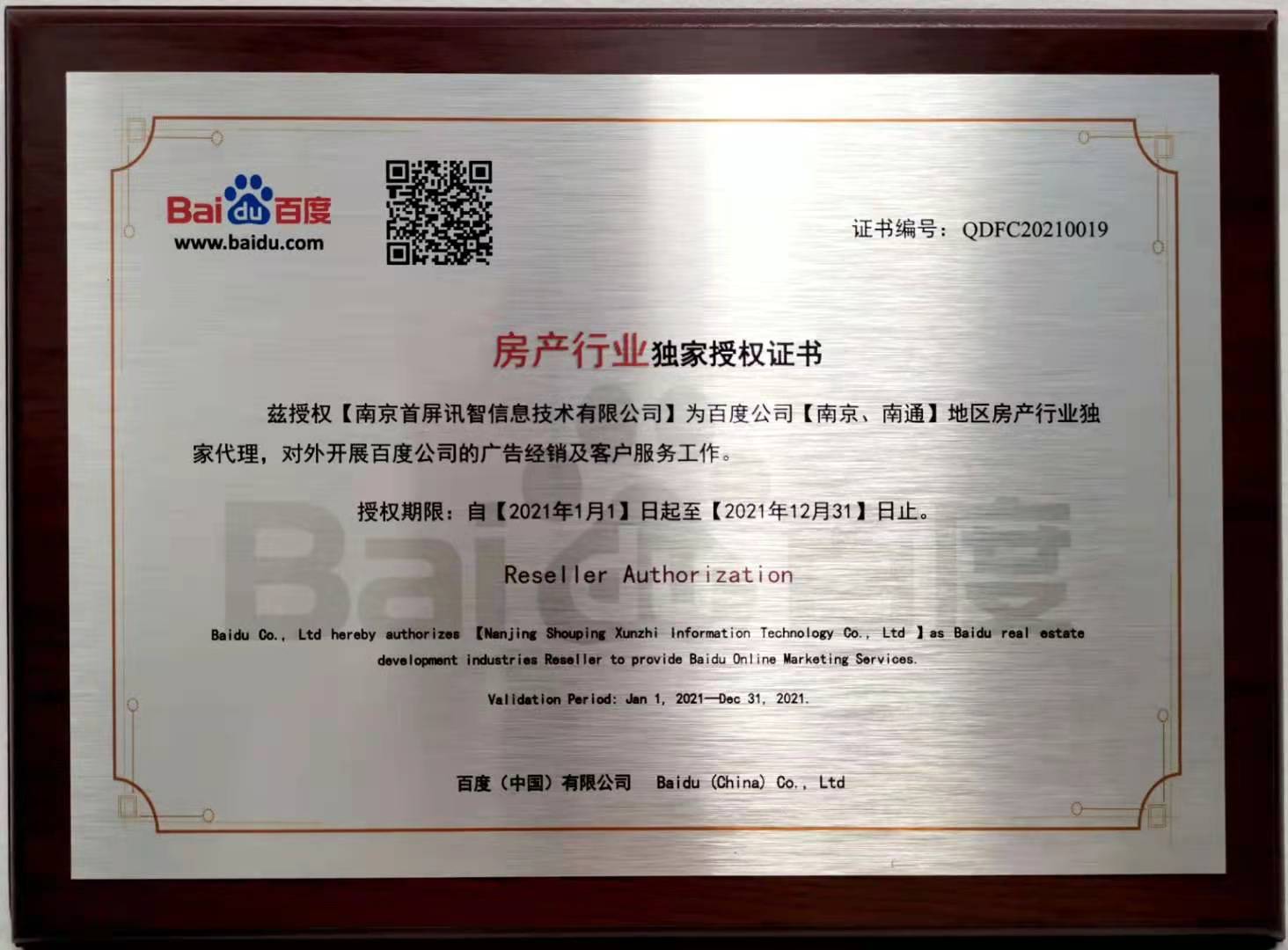 會(huì)上,百度公司正式授權(quán)南京首屏訊智信息技術(shù)有限公司為南京、南通地區(qū)房產(chǎn)行業(yè)獨(dú)家代理商及百度房產(chǎn)平臺(tái)南京、南通地區(qū)獨(dú)家運(yùn)營(yíng)商,并頒發(fā)授權(quán)證書。首屏訊智自2004年成為百度合作伙伴,始終致力于為廣大企業(yè)提供優(yōu)質(zhì)的互聯(lián)網(wǎng)營(yíng)銷服務(wù)。擁有17年豐富互聯(lián)網(wǎng)行業(yè)服務(wù)經(jīng)驗(yàn)的首屏訊智,已服務(wù)南京企業(yè)2萬余家,助力廣大企業(yè)快速穩(wěn)健發(fā)展。